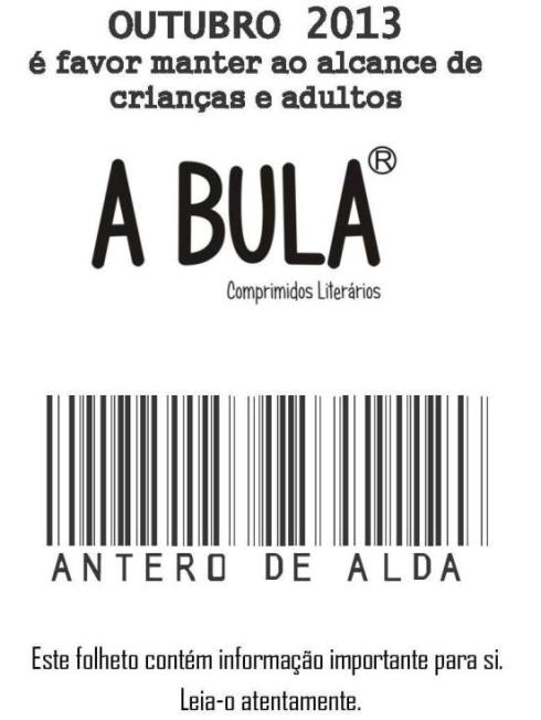 EM outubro, Antero de Alda, preenche A BULA com mensagens engarrafadas, para nós as lançarmos ao sabor da net. São dez recipientes, que cabem todos num desdobrável com tamanho A7, que depois de completamente aberto tem a forma A4. A BULA, como já devem saber, deverá ser mantida ao alcance e à vista das crianças e adultos e lida sempre de acordo com as indicações de cada autor. O titular da autorização de Introdução no Mercado e Fabricante é o Correio do Porto.